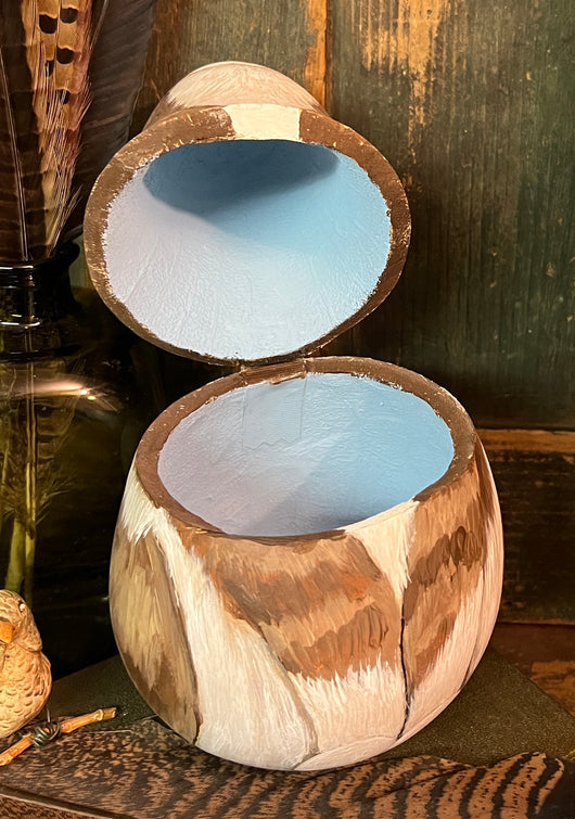 We're excited to offer this whimsical hand-painted Gourd, featuring a hinged lid. Measures 8" high.